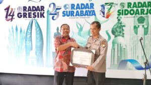 Penghargaan tersebut diserahkan oleh Direktur Radar Surabaya, Lilik Widyantoro, kepada Kasi Humas Polresta Sidoarjo AKP Tri Novi Handono yang hadir mewakili Kapolresta Sidoarjo. Penyerahan berlangsung dalam acara Halal bi Halal sekaligus peringatan ulang tahun Radar Surabaya, Sidoarjo, dan Gresik, Selasa (31/3/2026), di kawasan Kembang Jepun, Surabaya.